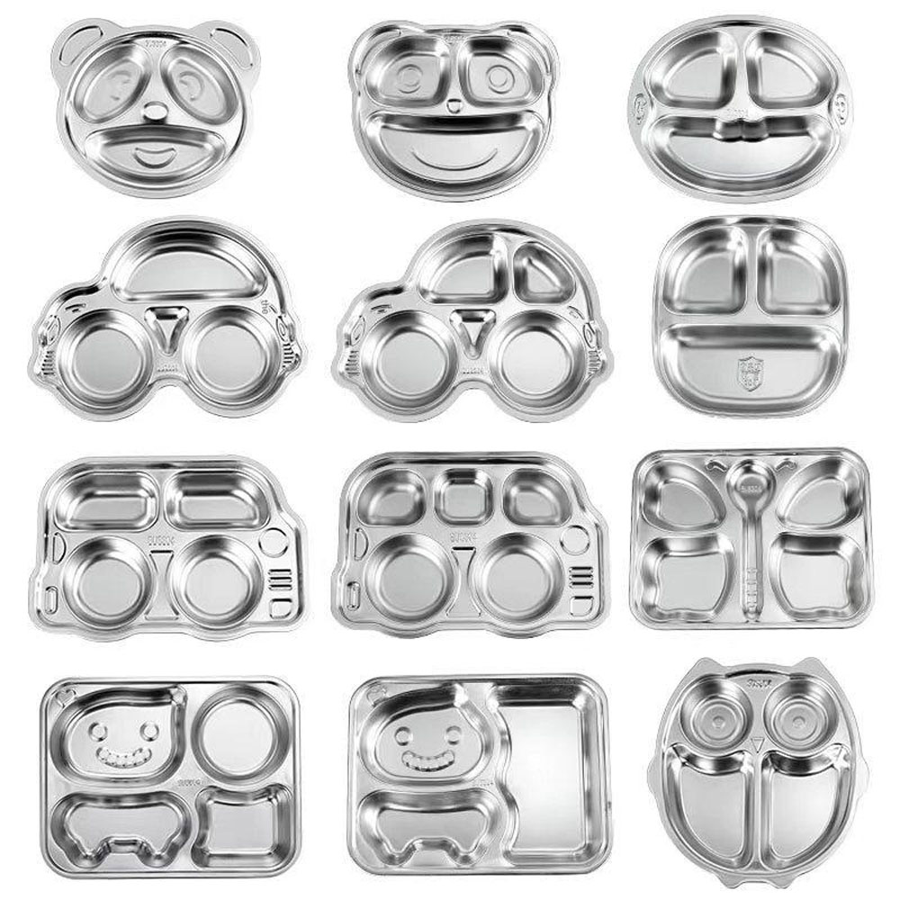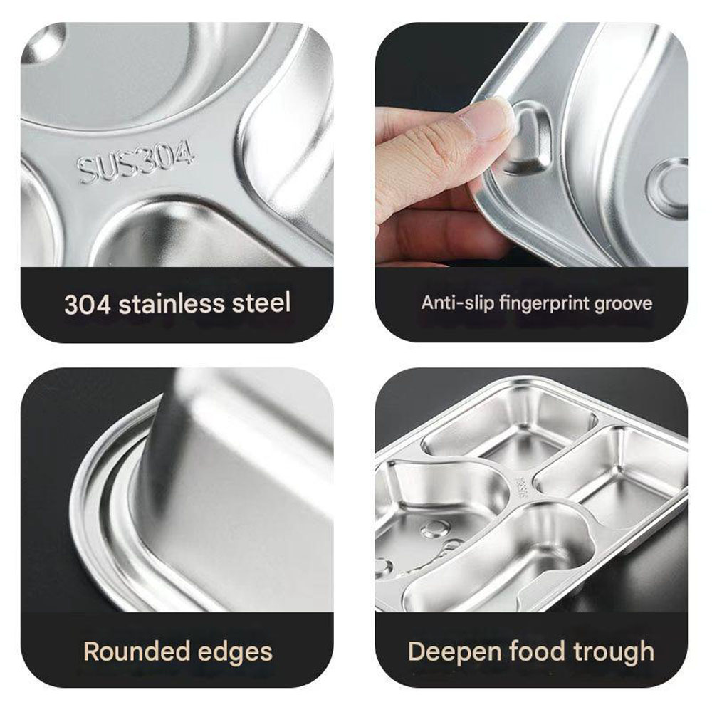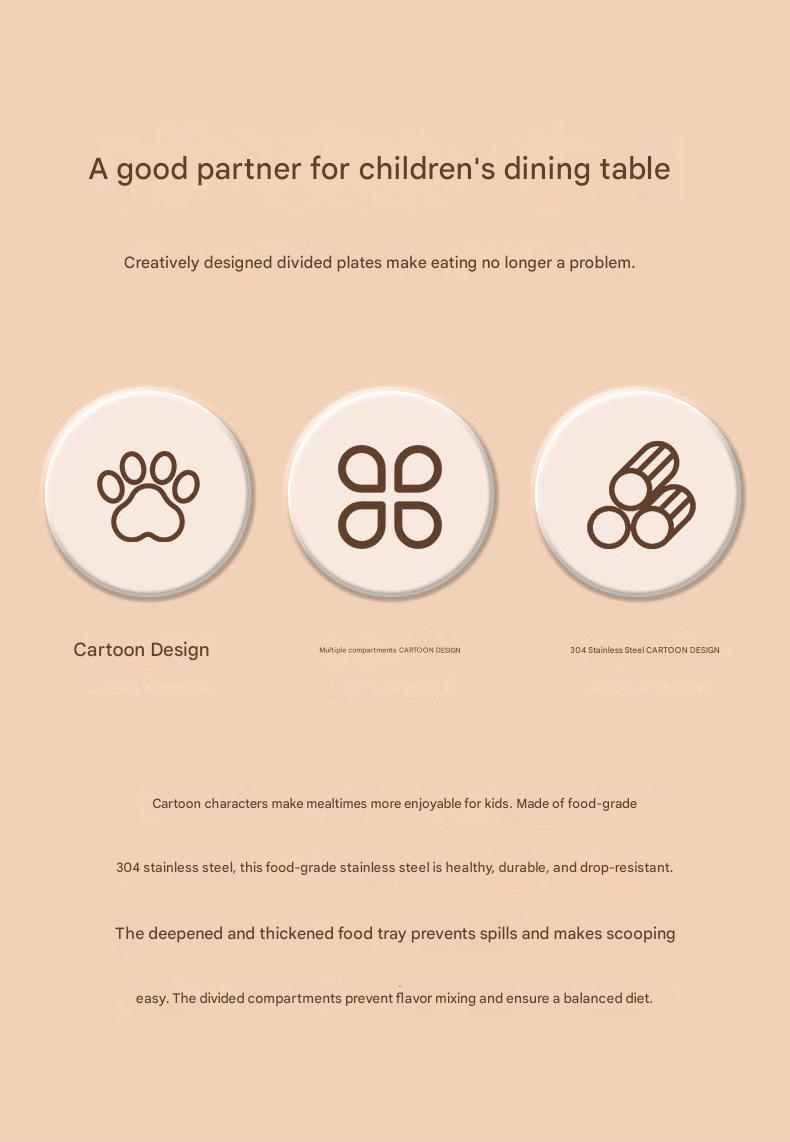 Animal-themed stainless steel dinner plate with modular compartment design; freely combinable patterns to stimulate your baby’s creativity.