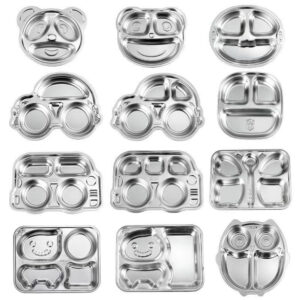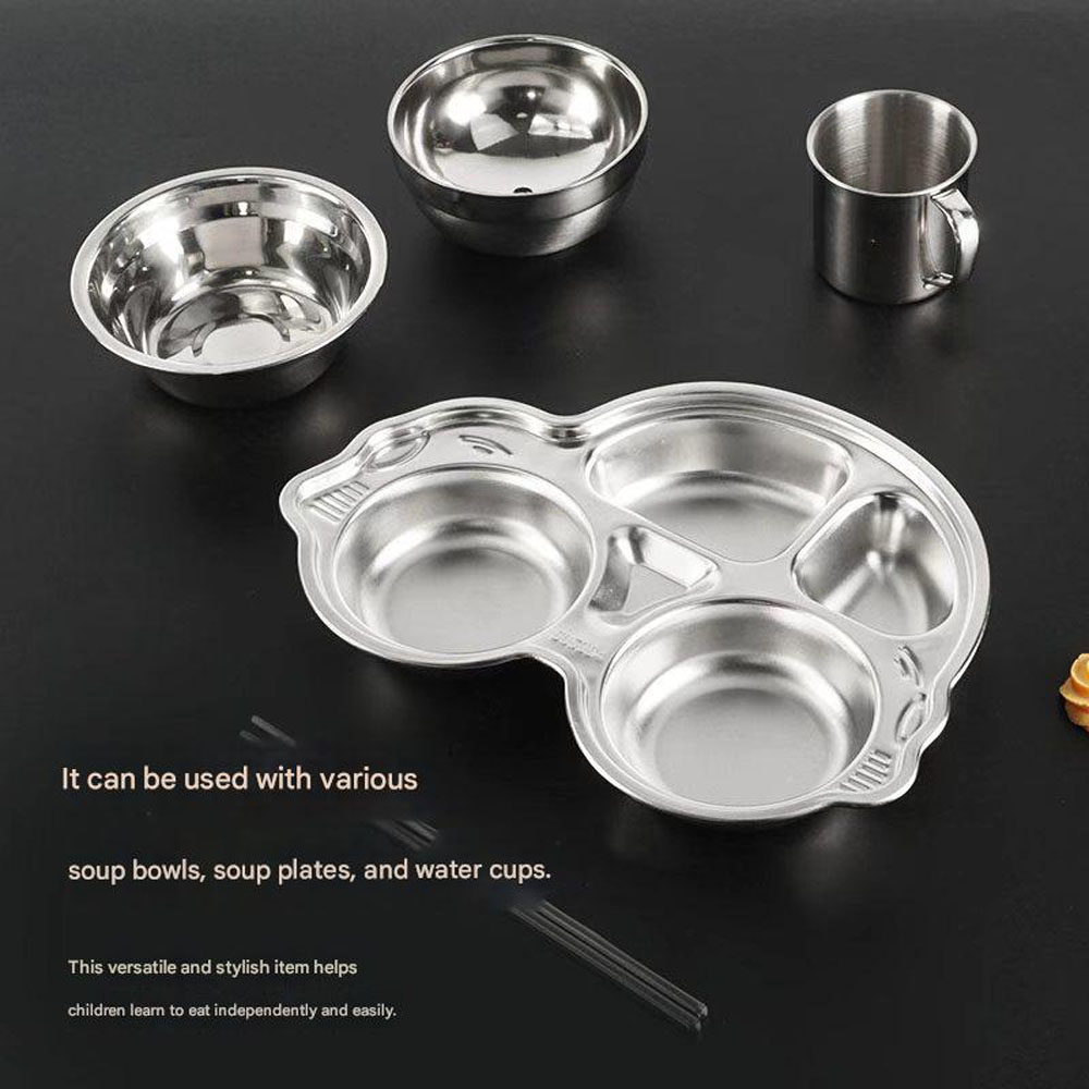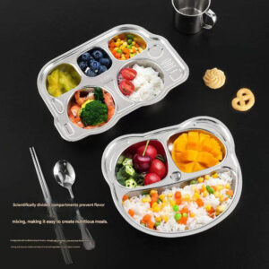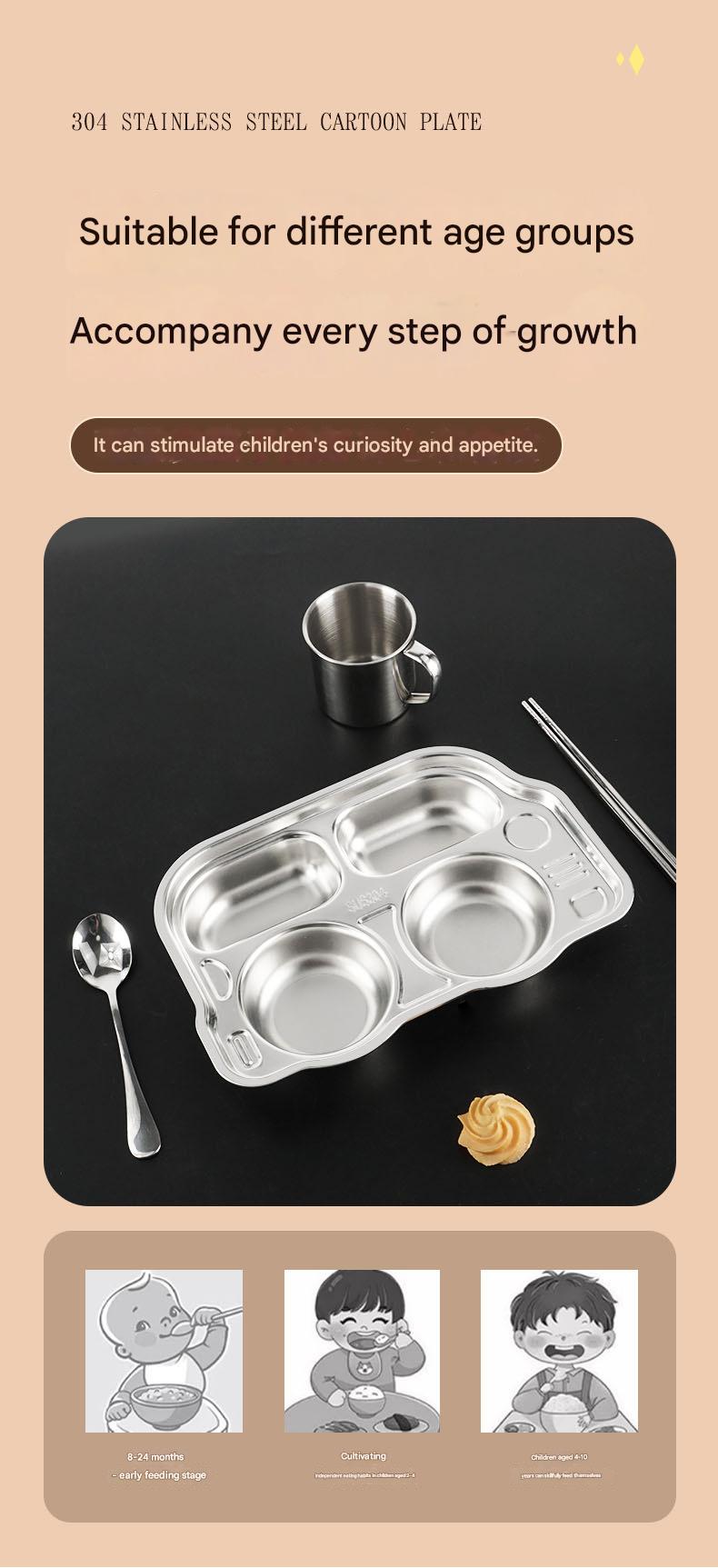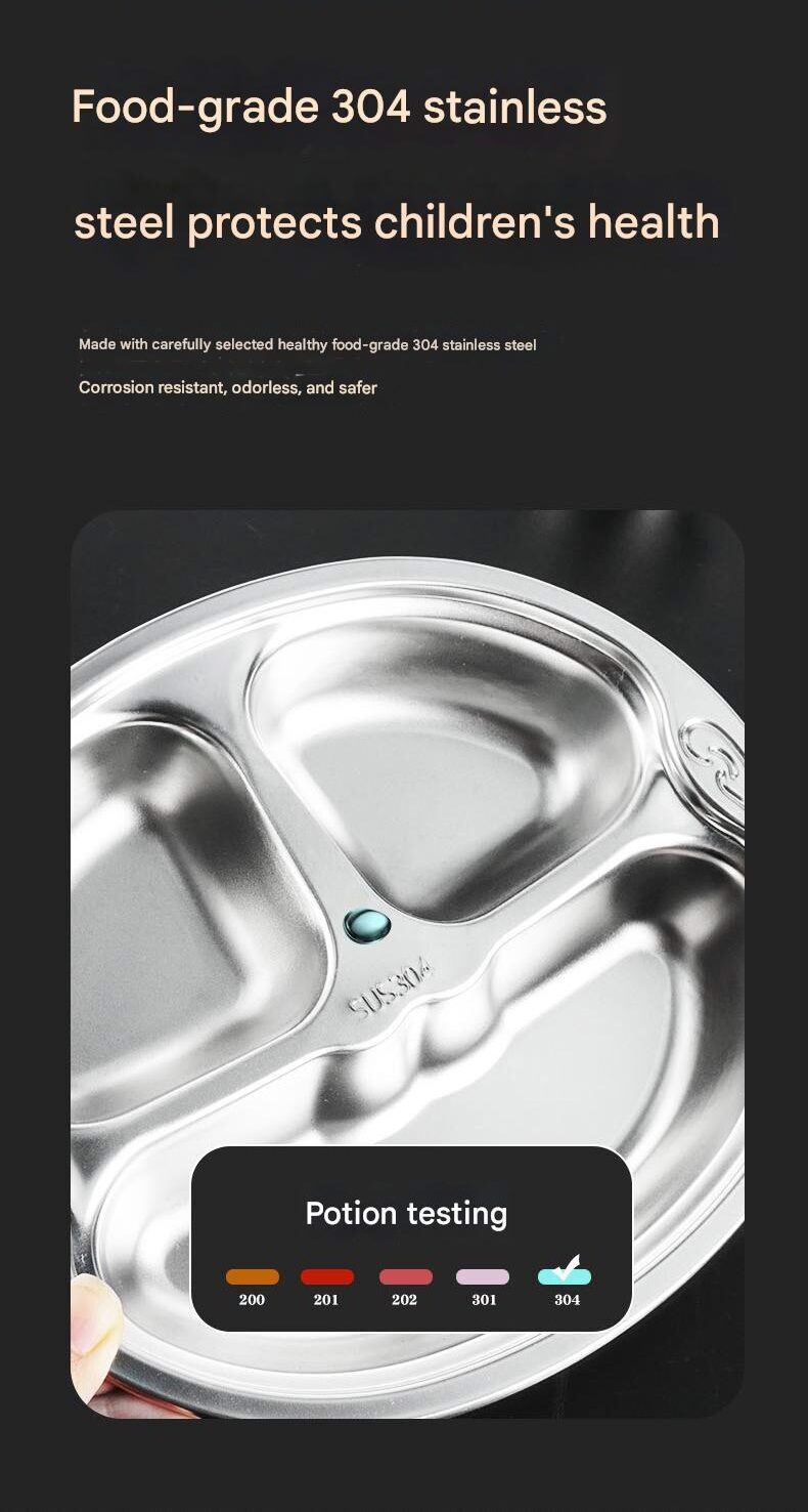 Animal-themed stainless steel dinner plate with modular compartment design; freely combinable patterns to stimulate your baby’s creativity.