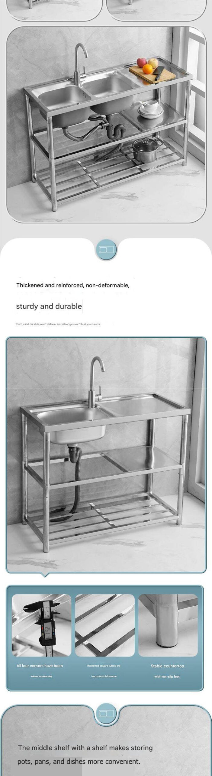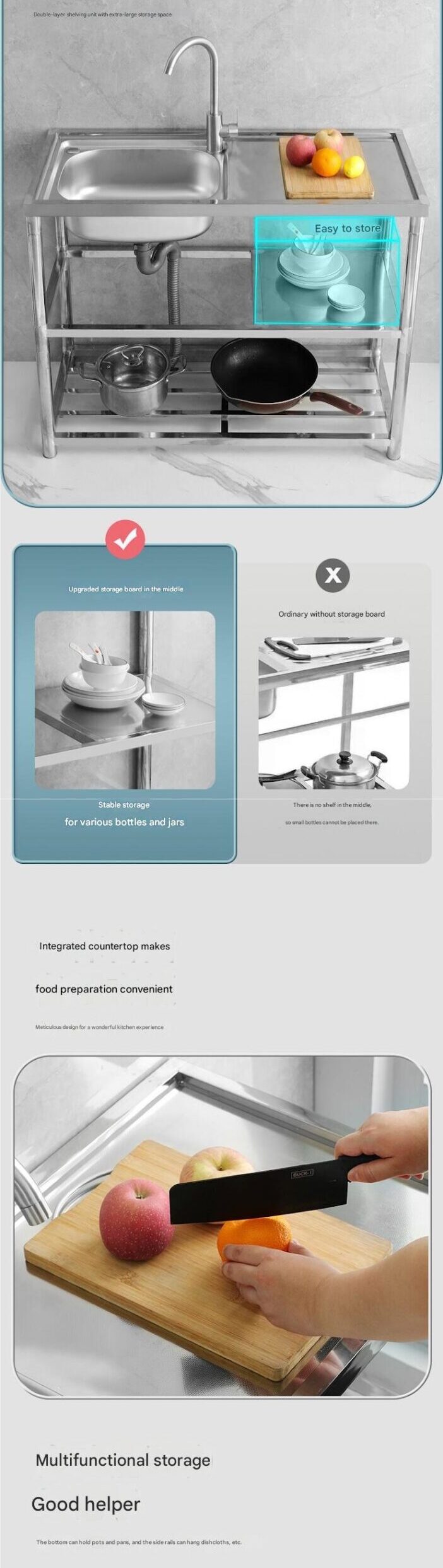 Stainless Steel Kitchen Sink with Countertop — Single or Double Bowl, Freestanding Washstand with Support Frame