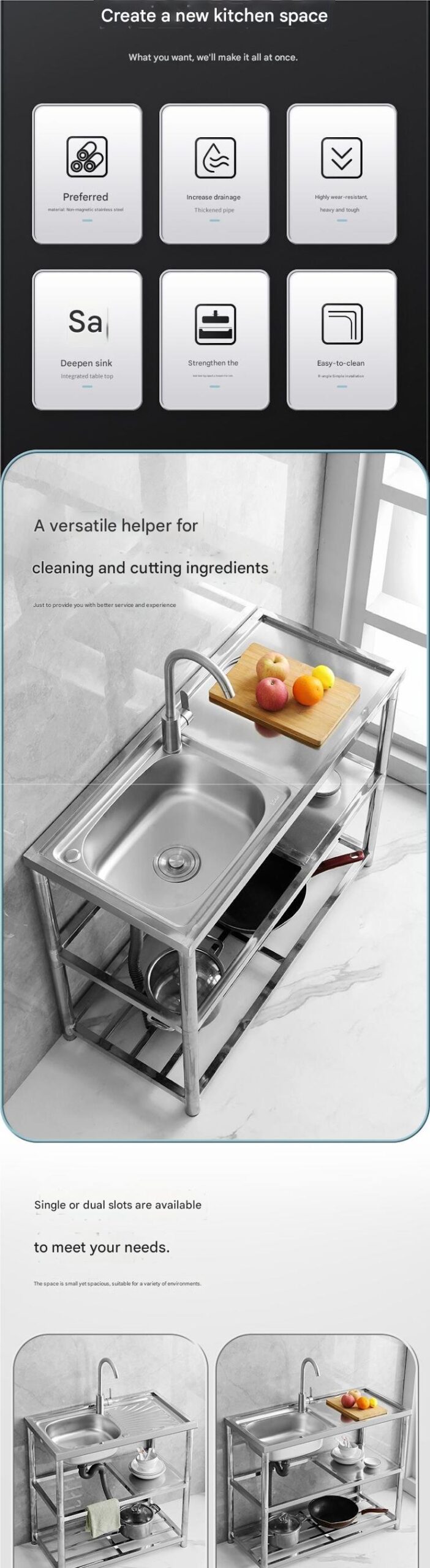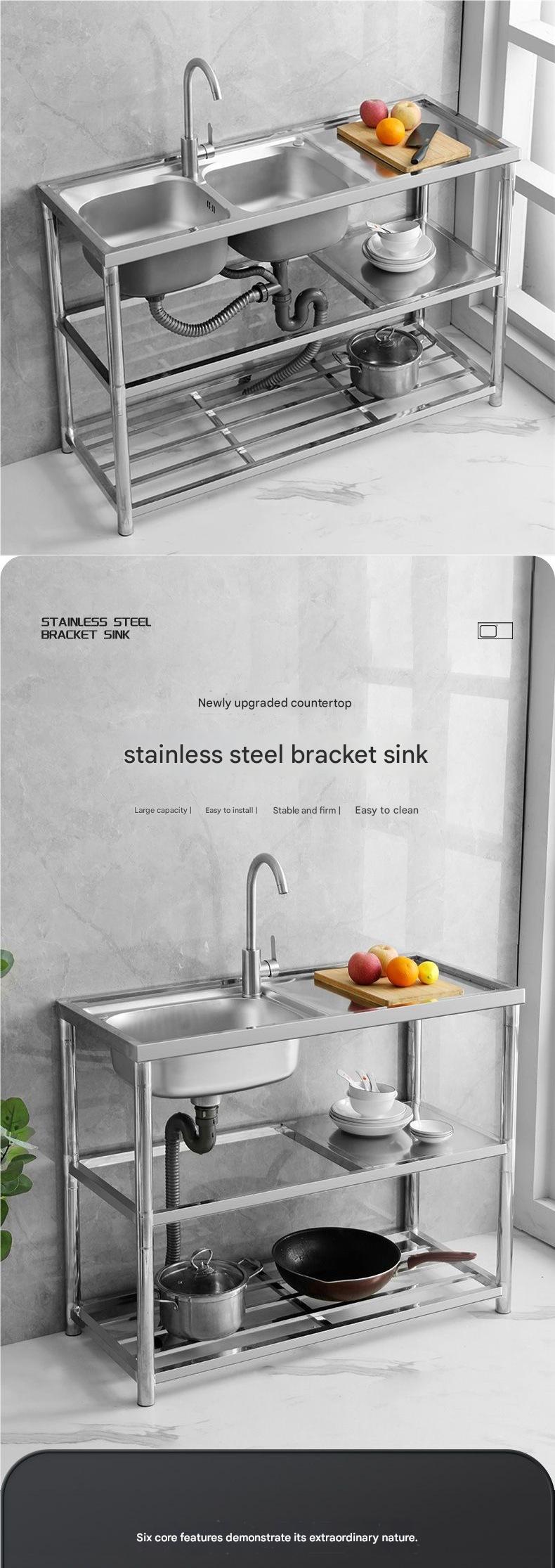 Stainless Steel Kitchen Sink with Countertop — Single or Double Bowl, Freestanding Washstand with Support Frame