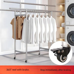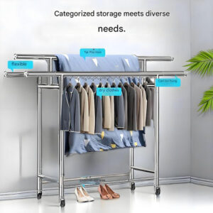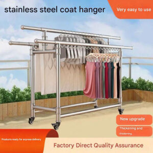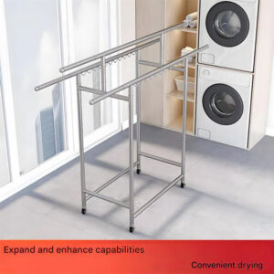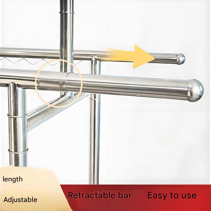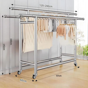 Foldable Stainless Steel Clothes Hanger: This product is a stainless steel clothes hanger with an adjustable length, ranging from 120-200 cm to 165 cm. The shortest length is 142 cm, and the width is 60 cm. Made of stainless steel, it is sturdy, durable, and not easily deformed.