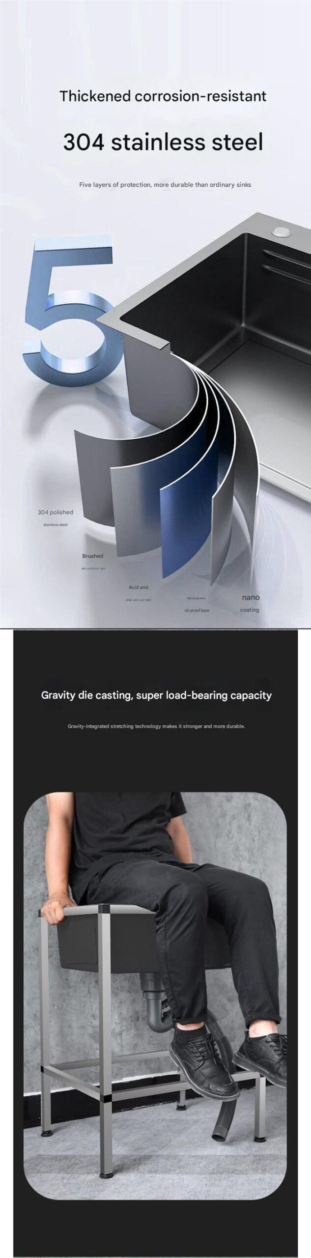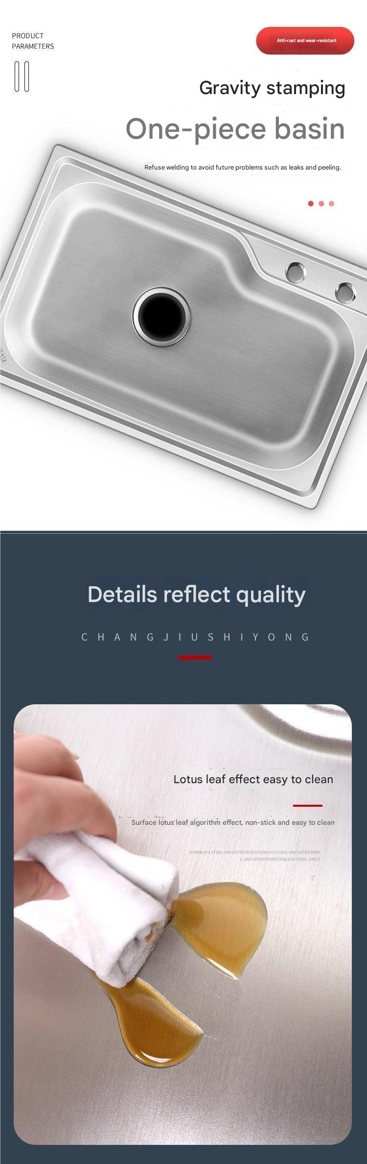 This kitchen sink features an integrated drain rack, is made of thickened stainless steel, has a single-basket vegetable washing area, and is a multi-functional kitchen work surface with a splash-proof design. It is easy to clean.