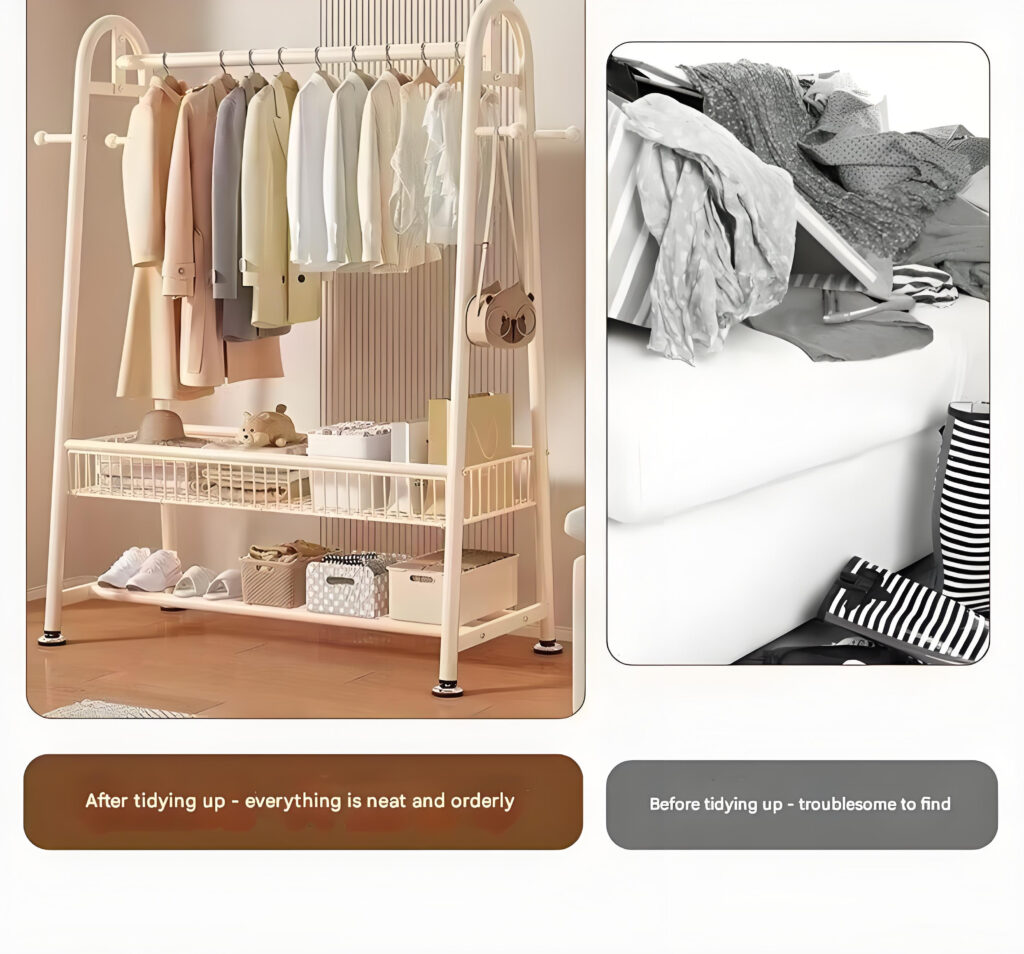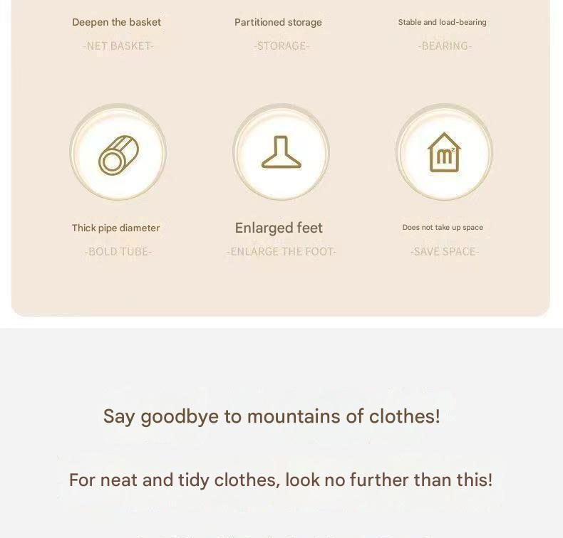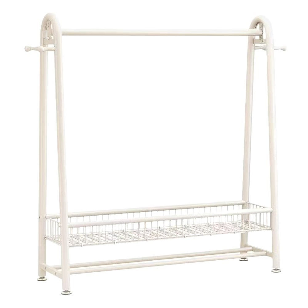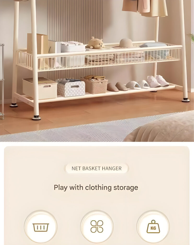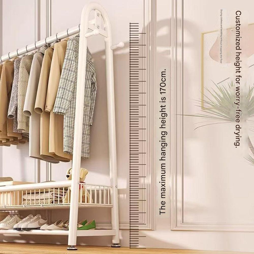 Thickened and reinforced carbon steel floor-standing clothes rack for home use, suitable for bedrooms and balconies, with heightened storage for clothes, hats, bags, and accessories.